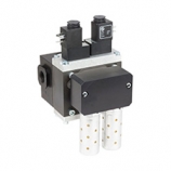 (1)雙聯組合電磁闊。這是一種不同大小的電磁閥組合在一起。大量使用的加油機對油的計量精度高達0.02%,都采用雙聯電磁閥。大閥開啟,使得加油在較短的時間內接近完成;然后大閥關閉,由小閥補充保證流量精度。此項技術國外已應用多年,產品由世界著名的電磁閥專業公司制造。順便指出國內油庫大流量的計量還在引進或仿造國外的結構較復雜、性能欠穩定的多段關閉閥,這種產品并非世界著名的專業公司所制,因為市場需求量沒達到足以引以他們的興趣。實際上我們的油庫采用國內生產的大流量的雙聯組合閥,效果會好得多。雙聯組合閥還常用來控制溫度、壓力、液位等參數。大閥保證基礎量,小閥提供補償量。在參數相對穩定的系統中,這種位式控制能達相當高精度。好些參數變化較大的系統,變化的速率仍受一定制約,例如溫度控制系統,仍受熱慣性的影響。所以運用得當的雙聯組合閥在滿足控制要求的前提下相對于調節閥能大幅降低成本。