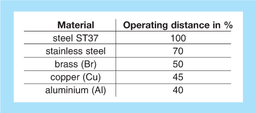 工作距離是物體與產生開關信號的有源傳感器表面之間的距離。工作距離取決于線圈的直徑。因此,更長的操作距離需要更大的傳感器。在某些EGE傳感器上,操作距離是可調節的。如果金屬物體僅阻尼交變場的一部分,則操作距離減小; 一個更大的物體會增加它。以下近似值來自由ST37鋼制成的標準矩形測量板,其邊緣長度對應于傳感器線圈的直徑或額定操作距離的三倍,以較大者為準。