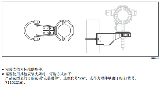 使用包裝中的安裝支架安裝變送器。安裝支架可以安裝在 1¼"...2"管徑的柱子上或墻壁上。