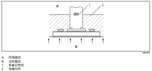 使用高溫型 FMD71 時,設(shè)備的保溫層厚度受限制。儀表上標(biāo)識有最大允許保溫層厚度和隔熱材料的熱導(dǎo)率(≤ 0.04 W/(m x K))、最高允許環(huán)境溫度和過程溫度。衛(wèi)生型過程連接上無保溫層厚度標(biāo)識。