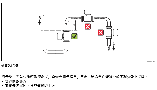 測量管中發生氣泡積聚現象時,會增大測量誤差。因此,請避免在管道中的下列位置上安裝: • 管道的高點 • 直接安裝在向下排空管道的上方 在豎直向下管道中安裝 在豎直向下管道(h ³ 5 m (16.4 ft))中安裝時,需要在傳感器下游處安裝虹吸管或泄放閥,避免抽壓 時損壞測量管內襯。此外,還可以防止液體短暫停滯在測量管中,產生氣障。