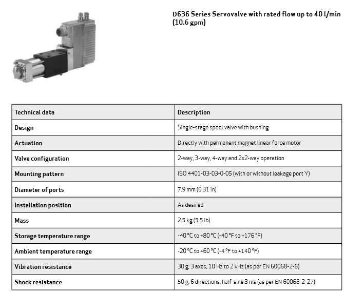 穆格公司已生產伺服閥和伺服比例、集成電子閥等有30多年的歷史,moog閥適用于各類機應用程序的使用。MOOG伺服閥D636-D637系列屬于直動式伺服控制閥,可應用于三通、四通和2*2通的節流型流量控制閥。適用于電液位置、速度、壓力或力控制系統以及其他需要高動態響應的系統。D636-D637系列伺服閥無需先導油源,通過具有高驅動力的永磁式線性力馬達直接驅動,具有電氣零位調節功能,當斷電或電纜損壞或緊急停車時,閥芯會無需使用外力自動返回到其彈簧對中位置。伺服閥直線力馬達具有高力范圍內提供無流量限制,直接驅動的設計意味著壓力無關的動態性能,低電流消耗和近零液壓,集成的數字電子很靈活性,現場總線接口高等級。