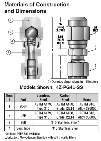 這些閥門沒有帽螺紋密封。必須慢慢打開閥門,操作人員遠(yuǎn)離直接通氣孔或閥門附近。因為在沒有蓋密封的情況下,當(dāng)閥被打開時少量的介質(zhì)將流過帽螺紋區(qū)域。清洗閥與PTFE球選項需要防漏關(guān)閉只用手指擰緊的操作和設(shè)計有一個可移動的上限球更換。
